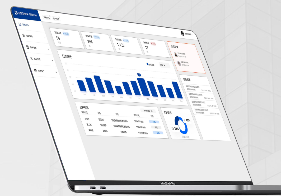 后台管理除常规项目管理、用户管 理及维保管理外,支持数据中心功能定 制化数据分析看板,支持企业产品及方 案首页同步推广功能。
